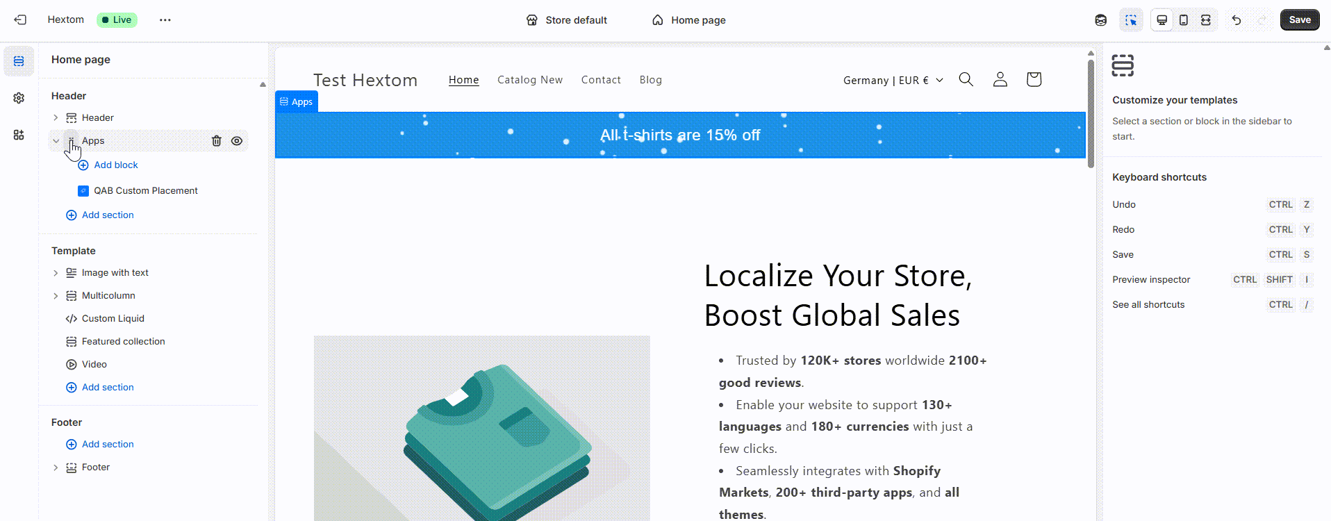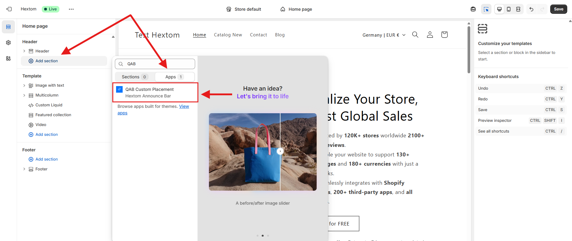 In the Header section, click Add Section > select Apps > then select Quick Announcement Bar or QAB Custom Placement.
