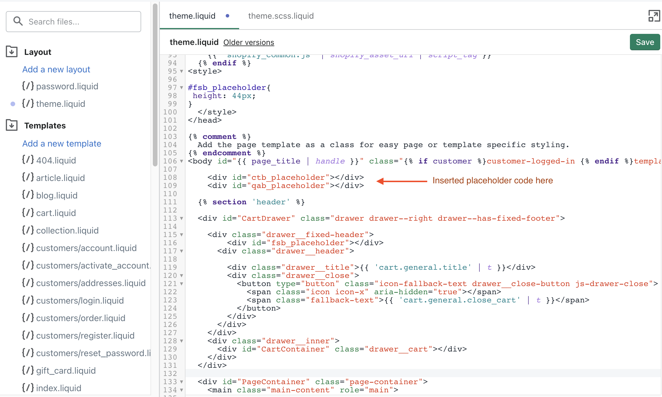 In this example, the placeholder code was inserted after the {% endstyle %} tags, but before any <div> tags. The result was similar to the previous placement method.