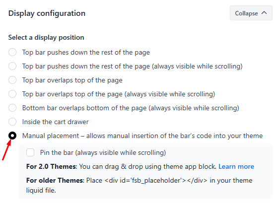 If you wish to place the Free Shipping Bar somewhere other than the top or bottom of the page, you can use the Manual Placement option.