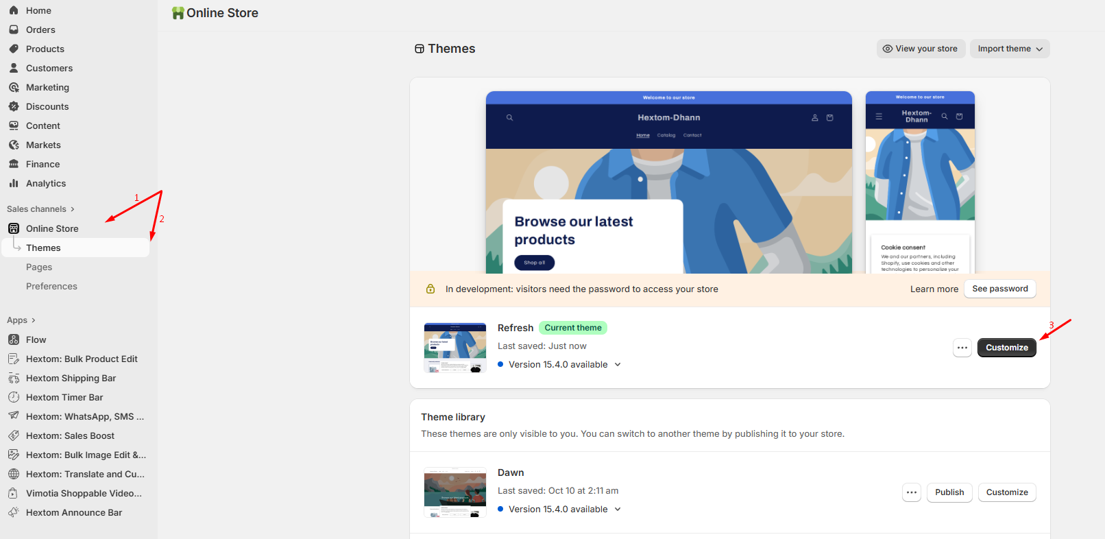 Step 2: Navigate to your theme customization screen by going to your Online Store Sales Channel, then to your Theme, then click customize as shown here: