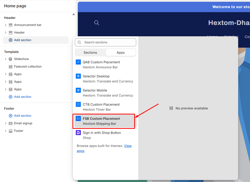 Then scroll to the bottom and you'll see a section called Apps. Among the options, you'll see Free Shipping Bar:
