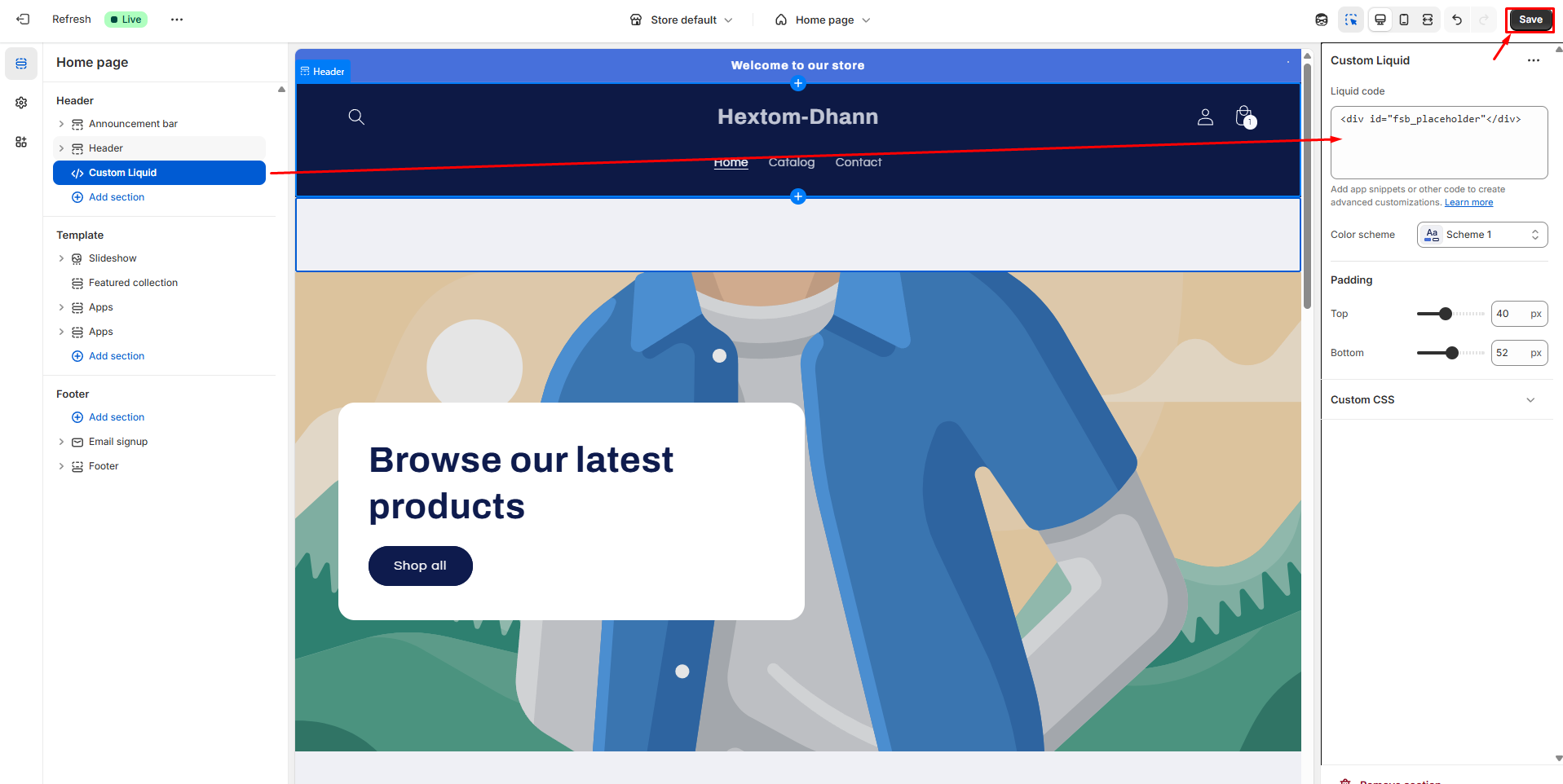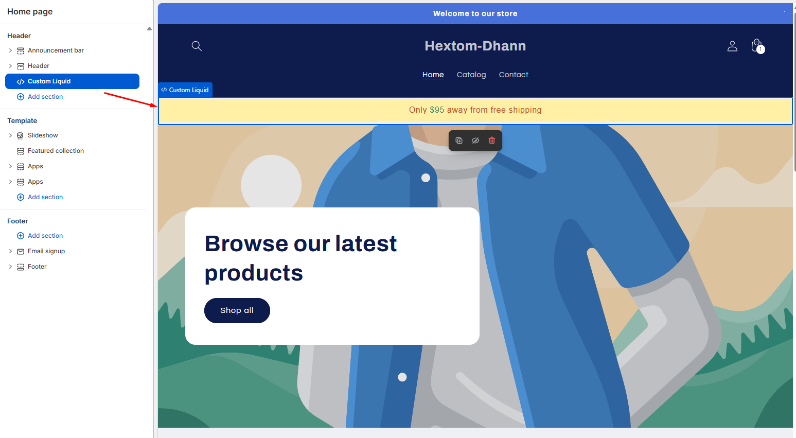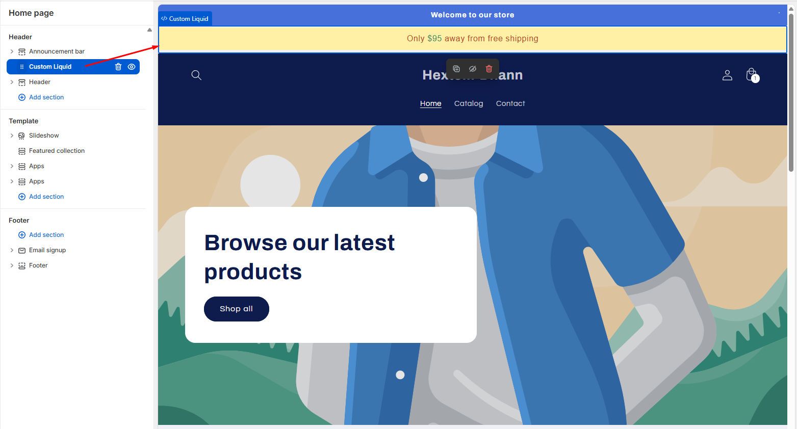 Step 4: You can click and drag the custom liquid to move the bar to any spot on the header. You cannot place the bar on the template using this approach.