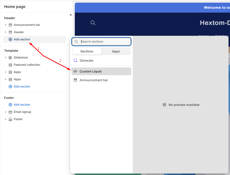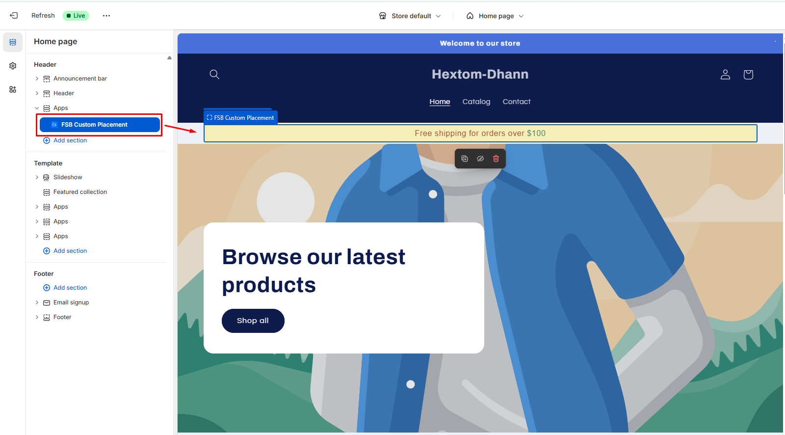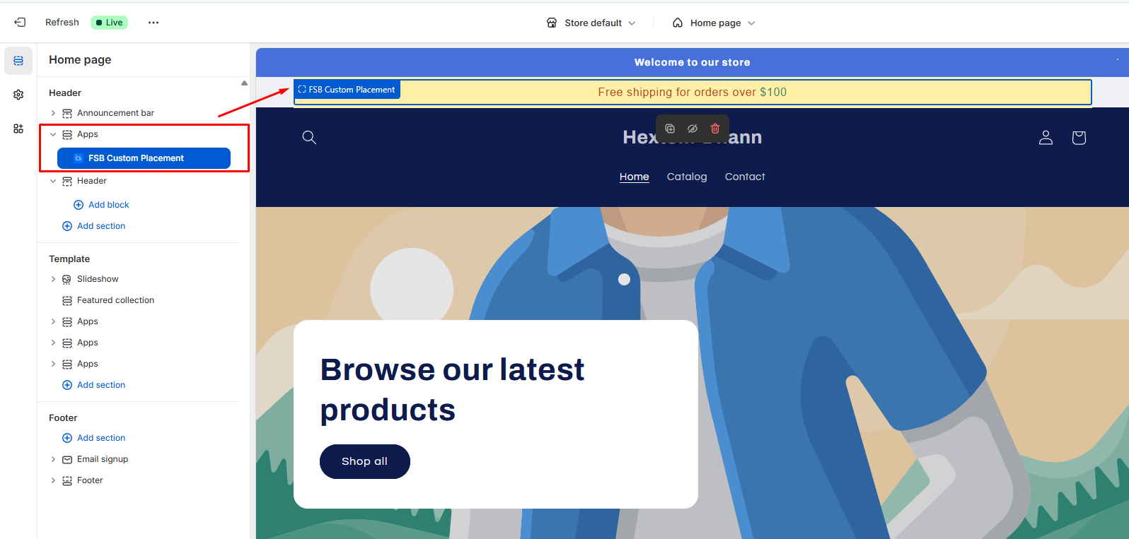 Step 4: You can click and drag the custom liquid to move the bar to any spot on the header. You cannot place the bar on the template using this approach.