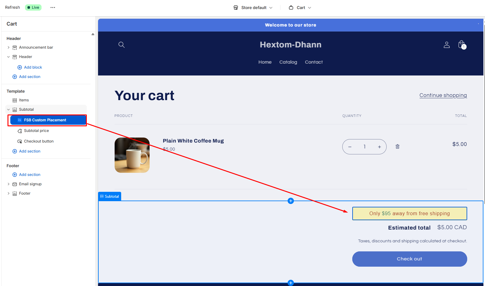 Using the same approach as before, you can click on Subtotal to open up the section and see the contents. In there you can click on Add block to add the FSB Custom Placement. In this example I dragged the block to above the subtotal.