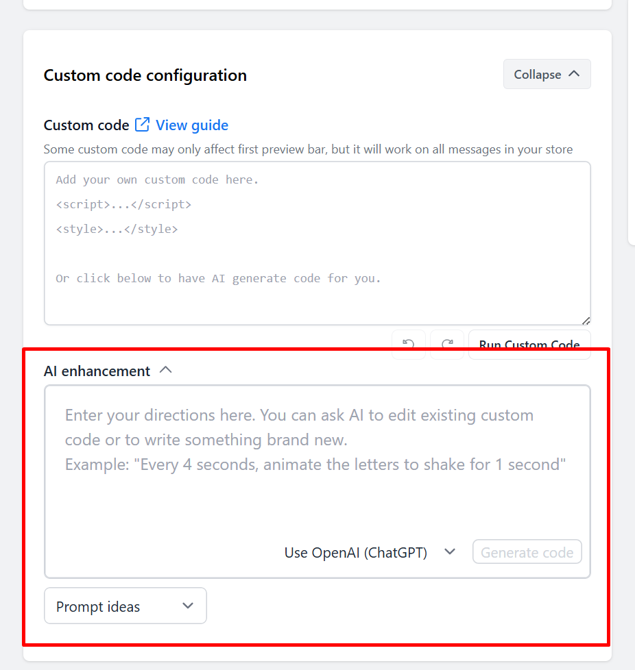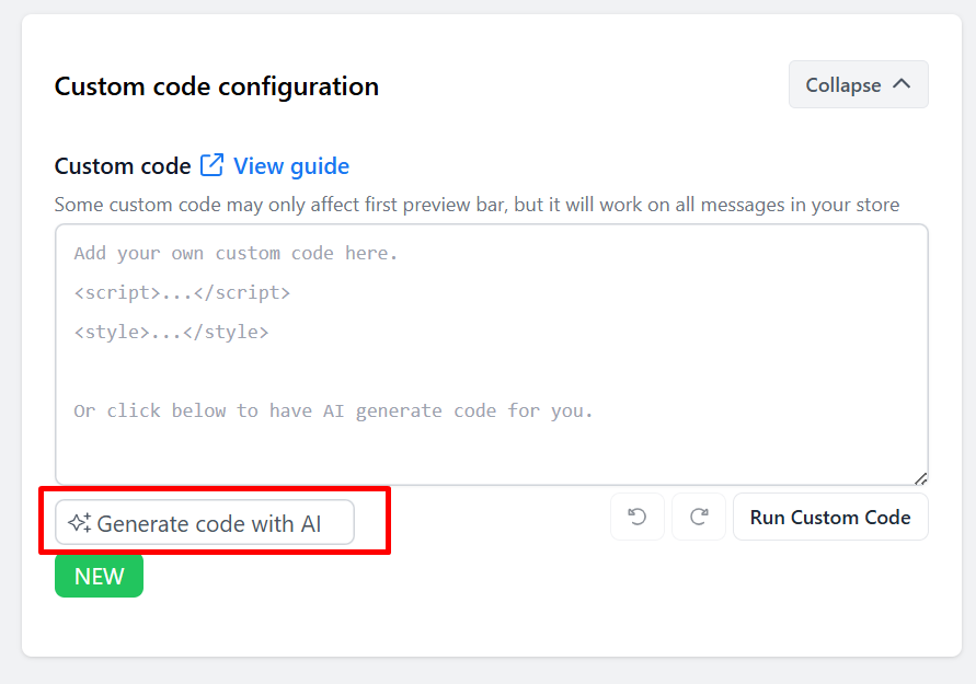 The custom code section is a place where you can add custom styling or scripts that will run when the bar loads. It is designed to allow merchants and their developers more flexibility over the app.