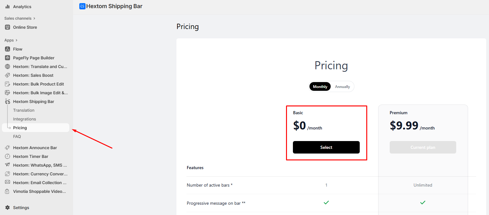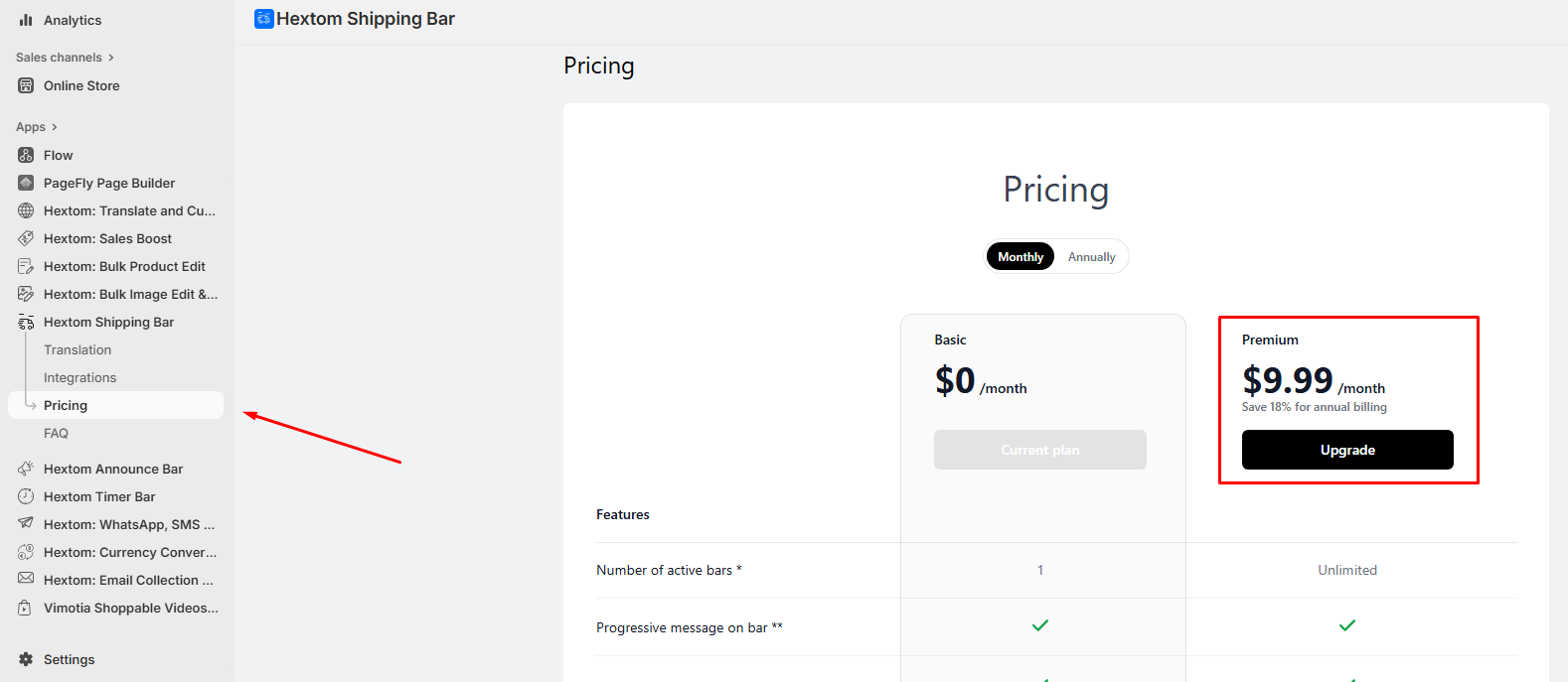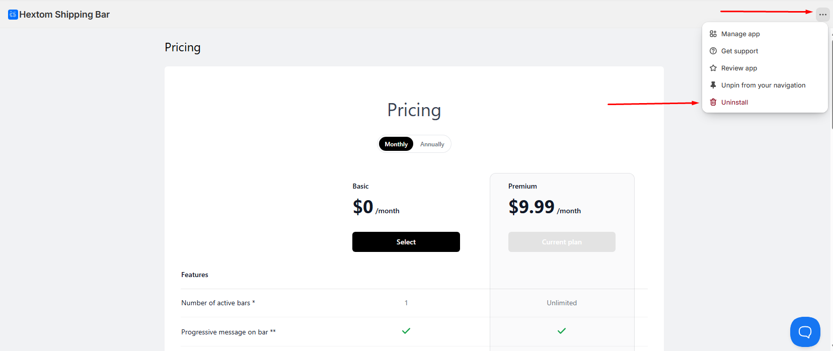 The Free Shipping Bar (FSB) app offers both Free and Premium plans, allowing you to choose the best option for your store’s needs. Below is an overview of the features included in each plan, along with details about upgrading, canceling, and uninstalling the app.