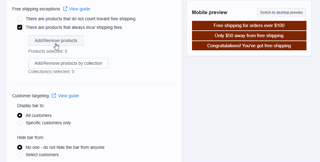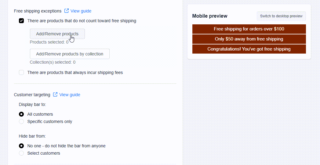 Free Shipping Bar offers you the ability to exclude specific products from counting toward free shipping, as well as mark products that always have shipping fees.