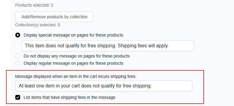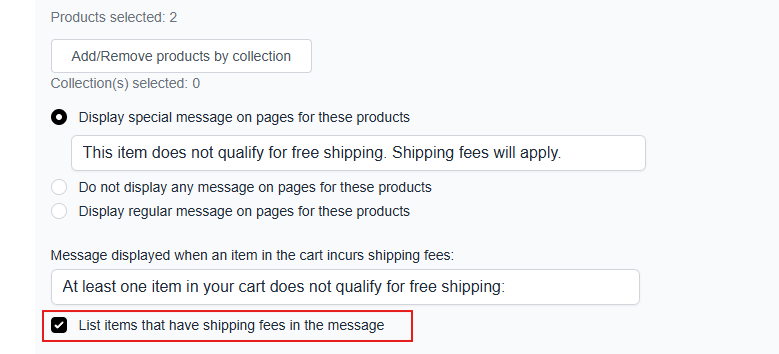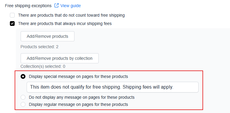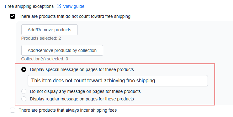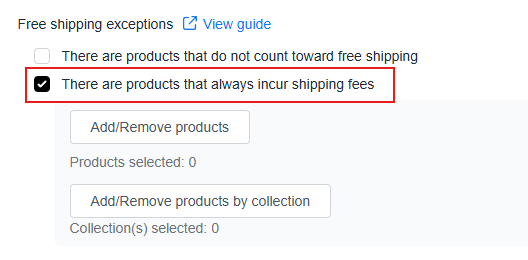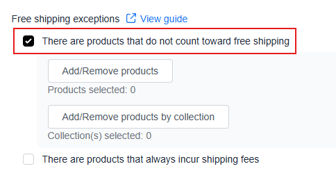 - Go to the Free Shipping Exceptions setting, then click the checkbox on option 1: There are products that do not count toward free shipping. A new section will appear where you can add products, either individually or by collection.
